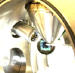 This picture shows the Everhart-Thornley secondary electron detector with its Faraday cage, alongside the conical final electro-magnetic lens. The detector works by attracting the secondary electrons dislodged by the electron beam, which then strike a scintillator which emits photons. These, in turn, are amplified using a photo-multiplier which provides an electric signal at its output.