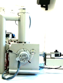 The cylindrical structure is the column, containing the tungsten filament, the cathode, anode and electromagnetic lenses and scanning coils. This sits on the specimen chamber, which is the square shape directly below it. The cylindrical housing projecting forward contains the control mechanisms for the stage (see later), and the four knobs on its front face permit manual control of the stage. The lever at approximately “10 o’clock” is for tilting the stage (which can only be carried out manually).