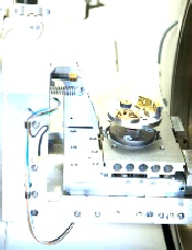 This shows the inside of the chamber door, viewed from the right, with the specimen stage. Depending on the size of the specimen mount (or “stub”) the stage can accommodate up to seven separate stubs. The stage can be moved in the X, Y and Z (vertical) directions, and also rotate about its central axis, all under control of the Windows® interface, or alternatively using the knobs on the chamber door. In addition, the stage can be tilted manually.
