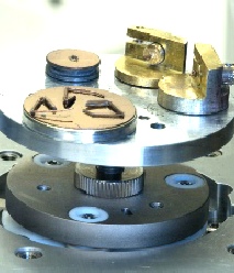 This provides a closer view of the stage, which is shown holding standard half inch and one inch stubs, along with two custom made stubs providing the facility manually to rotate specimens held in a small horizontal aluminium rod.